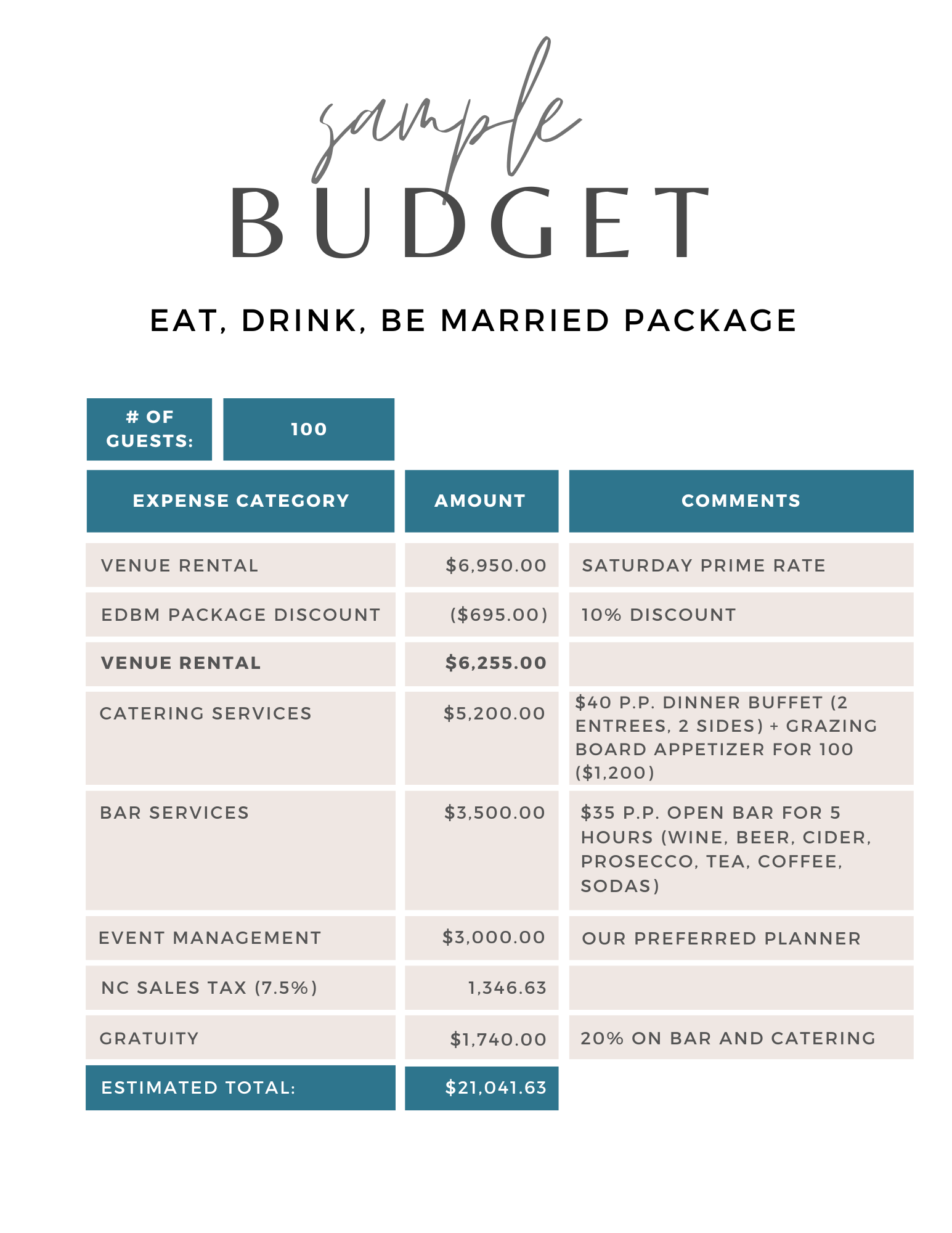 For guest count of 100, on a Saturday during prime season (Apr, May, Sep, Oct) your budget for venue, bar, catering and event management could be approx. $21,000 - see a sample budget below. Please note that this estimate does not include other typical wedding budget expenses such as photographer, DJ / entertainment, wedding attire etc.